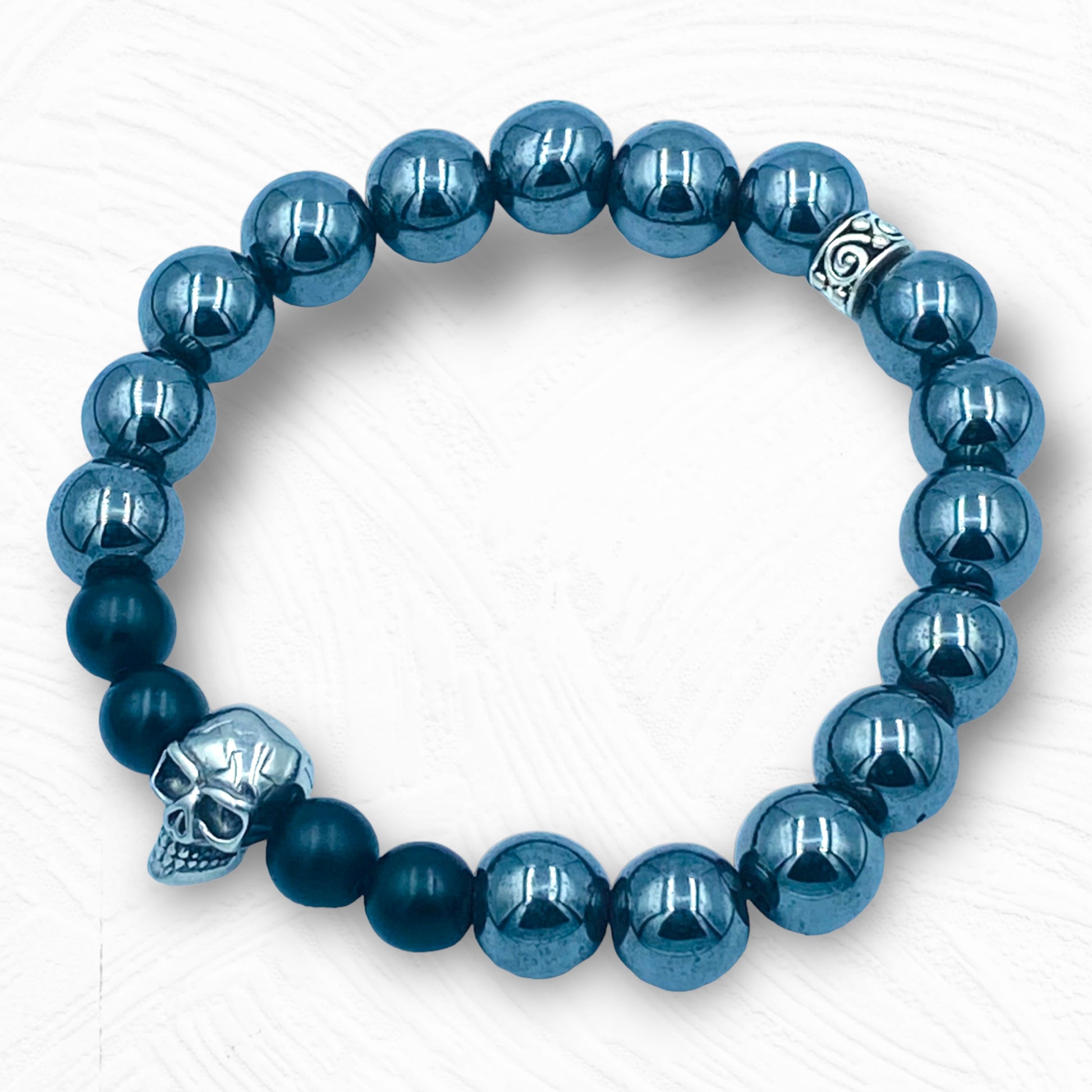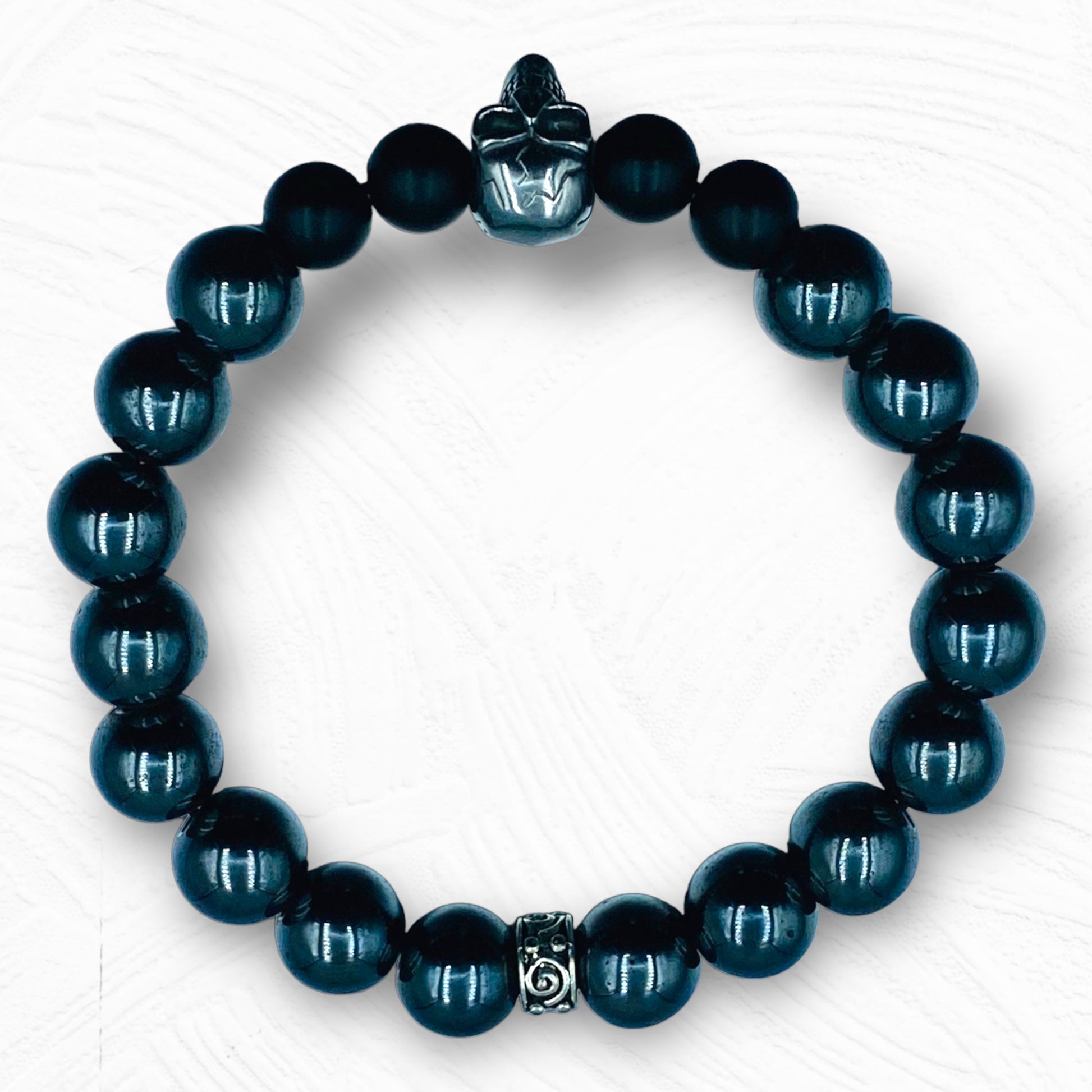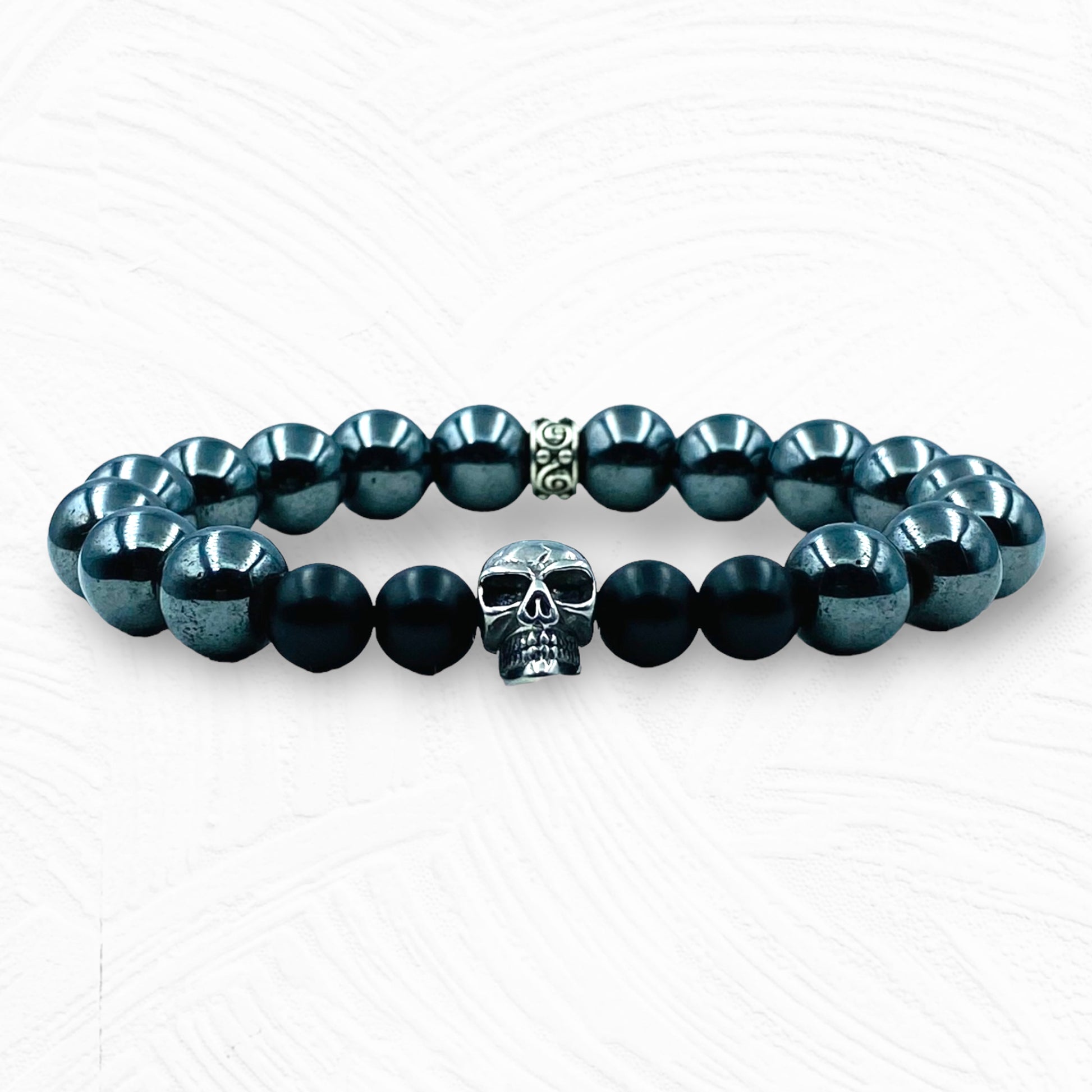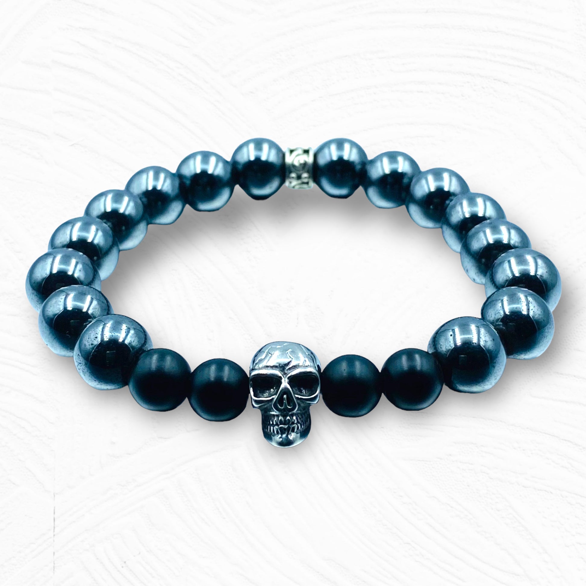 Skull piedra hematita negra natural con obsidiana negra mate esta pulsera fortalece la conexión con la tierra, aumenta el coraje y la protección. La piedra puede ayudar a entender y distanciar nuestros comportamientos que van en contra de nuestras ambiciones.