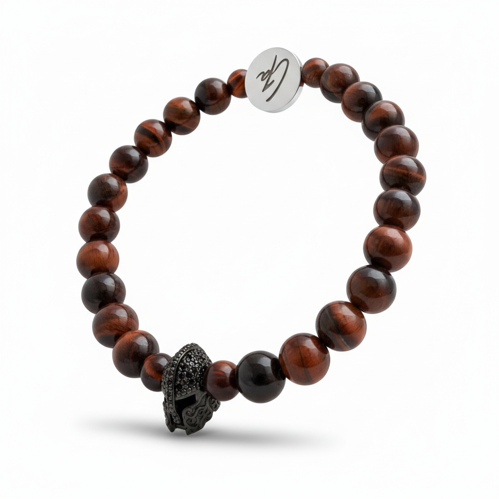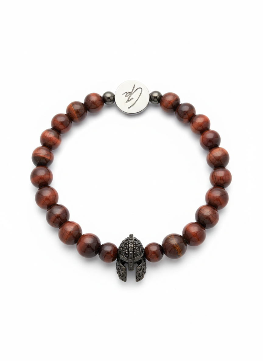 Brazalete artesanal que combina la energía protectora del ojo de tigre rojo con la elegancia del ónice negro. Complementado con un dije en forma de casco espartano adornado con circonitas negras que añaden sofisticación y brillo. Pieza única diseñada para quienes buscan joyería con significado, fusionando la tradición de las piedras naturales con el simbolismo clásico. Ideal para uso diario o como accesorio de impacto en cualquier ocasión.