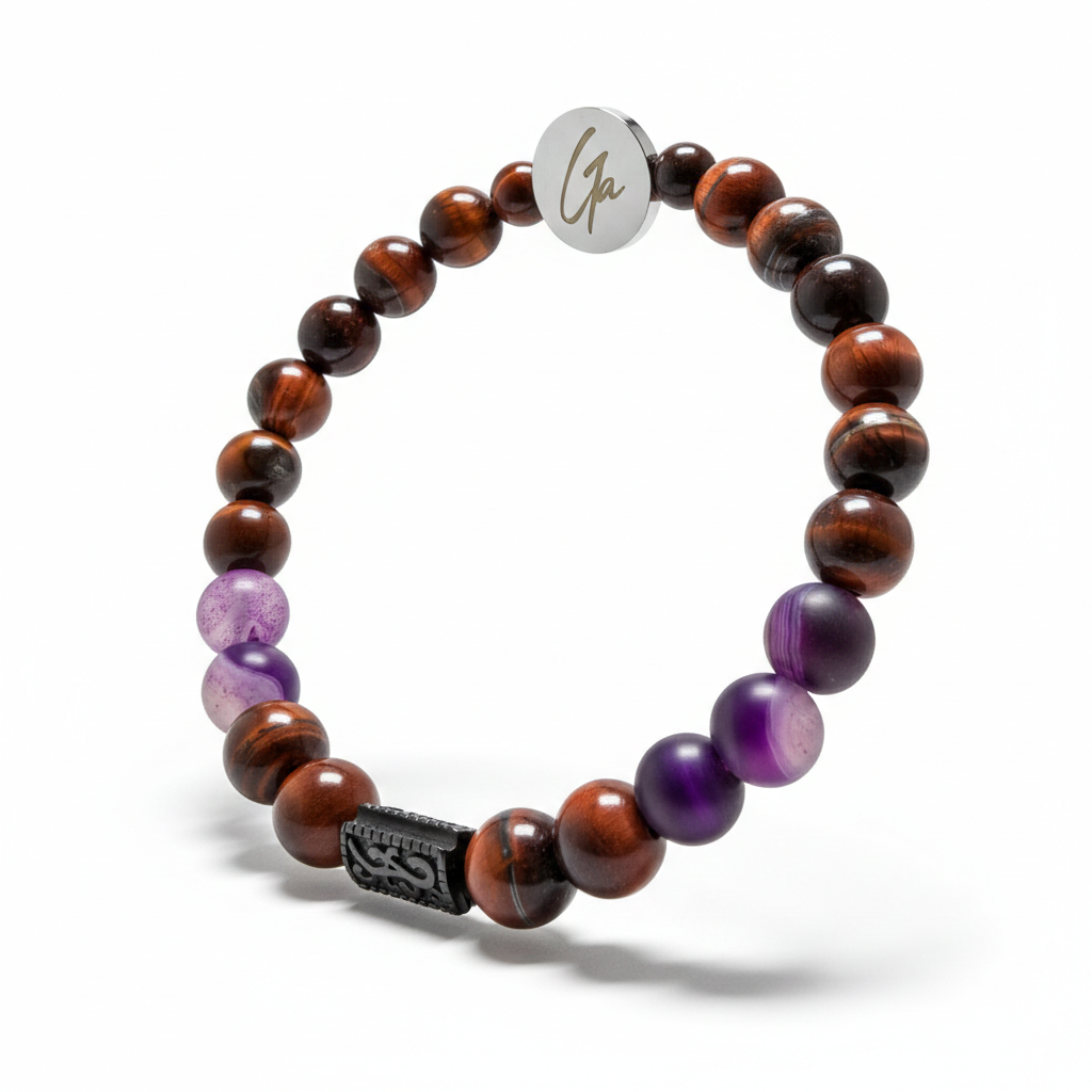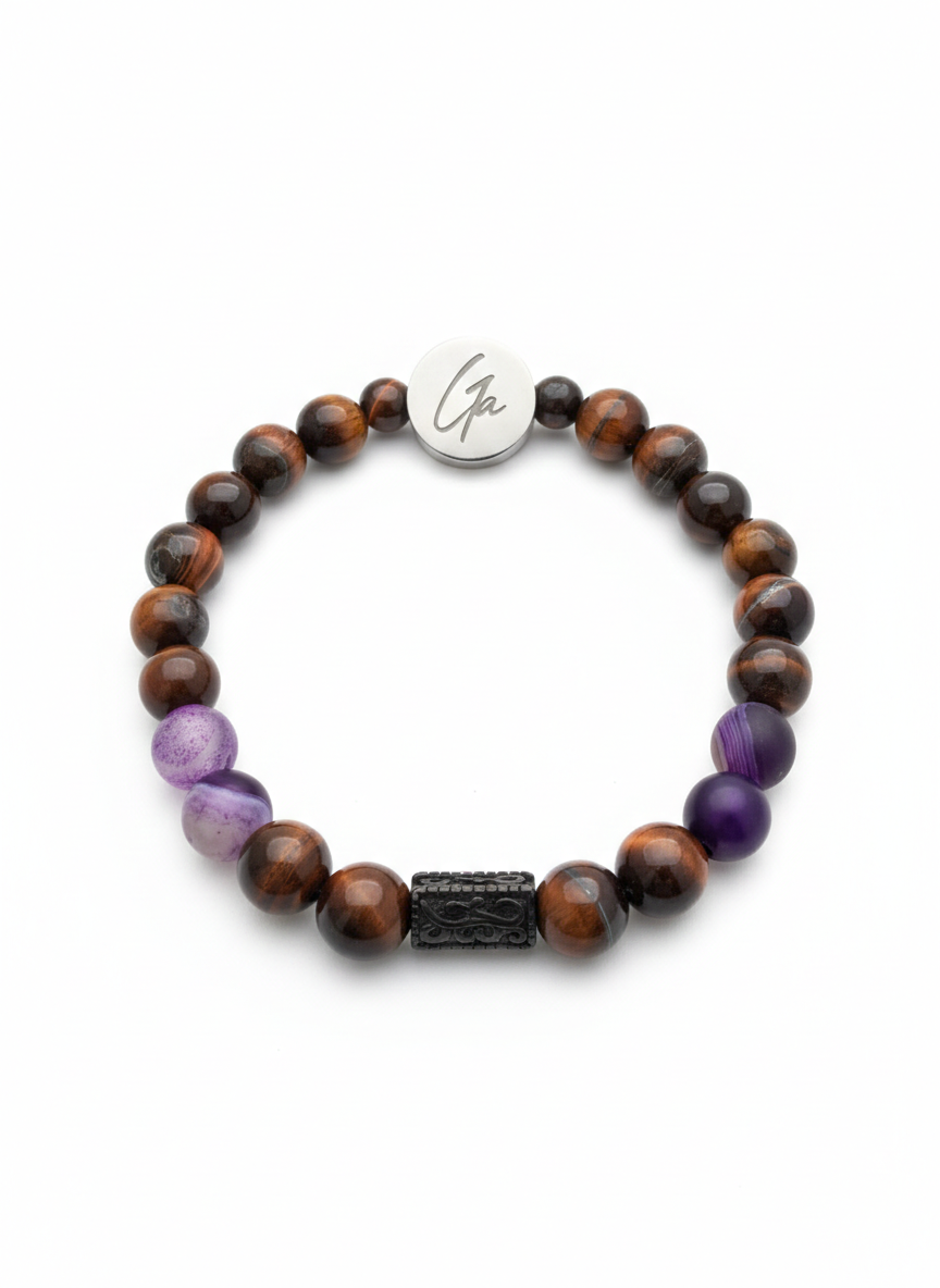 Brazalete confeccionado con piedras naturales de ojo de tigre y ágata púrpura, combinadas con un dije rectangular en acabado negro mate. Esta pulsera fusiona la elegancia mineral con un diseño contemporáneo, aprovechando las propiedades energéticas tradicionales de estas gemas. El ojo de tigre aporta protección y claridad, mientras que la ágata púrpura favorece la calma y la intuición. Pieza versátil que complementa tanto looks casuales como más sofisticados, ideal para quienes valoran la joyería con significado.